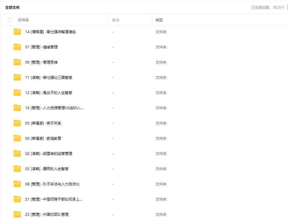 全网最齐全的曾仕强教授所有讲座课程合集了 课程内容非常多,只截图小部分仅供预览: 声明:本站所有文章,如无特殊说明或标注,均为本站原创发布。任何个人或组织,在未征得本站同意时,禁止复制、盗用、采集、发布本站内容到任何网站、书籍等各类媒体平台。如若本站内容侵犯了原著者的合法权益,可联系我们进行处理。