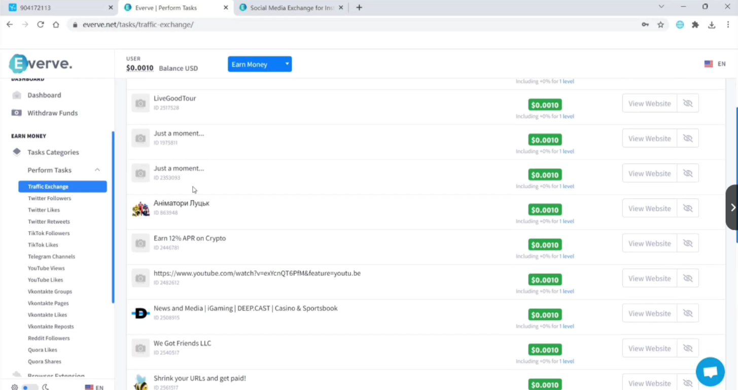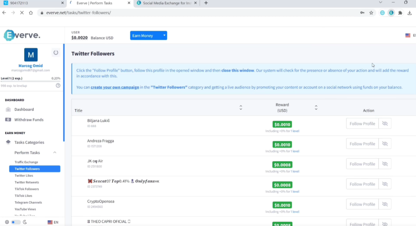 Everve国外点赞关注平台。主要是用来做ins、推特、脸书、海外抖音等平台的点赞关注的平台,然后利用脚本全自动去做任务,一个窗口大概1-2美金一天,普通电脑开30个没问题,一天就是30-60美金左右,好的配置可以容纳更多